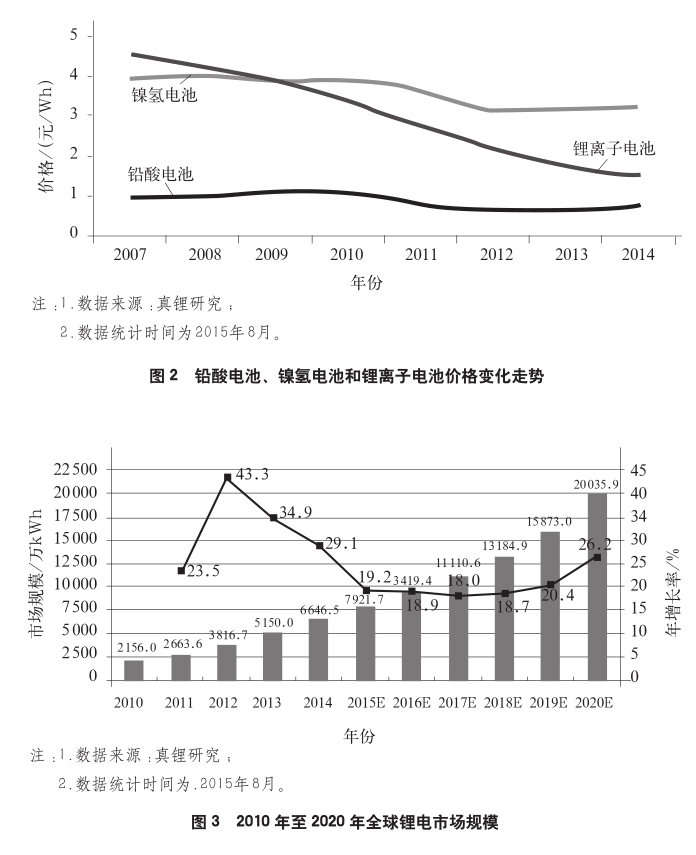 從鉛酸電池、鎳氫電池和鋰離子電池價(jià)格變化走勢(shì)(圖2)可以看到,與鎳氫電池相比較,鋰離子電池在2007年時(shí)的性價(jià)比就已經(jīng)超越了鎳氫電池,絕對(duì)單位價(jià)格在2009年時(shí)就已經(jīng)低于鎳氫電池。與鉛酸電池相比較,鋰離子電池循環(huán)壽命普遍是鉛酸電池的2倍以上,價(jià)格在2014年也已經(jīng)下降到2倍左右,二者的單位循環(huán)壽命價(jià)格幾乎相當(dāng),性價(jià)比方面則開(kāi)始占據(jù)優(yōu)勢(shì)。同時(shí)可以看到,鉛酸電池的價(jià)格已進(jìn)入一個(gè)上升通道,而鋰離子電池價(jià)格還有下探空間。因此,可以將2014年看做一個(gè)時(shí)間拐點(diǎn),在這之后,鋰離子電池替代鉛酸電池的進(jìn)程將會(huì)顯著加快。